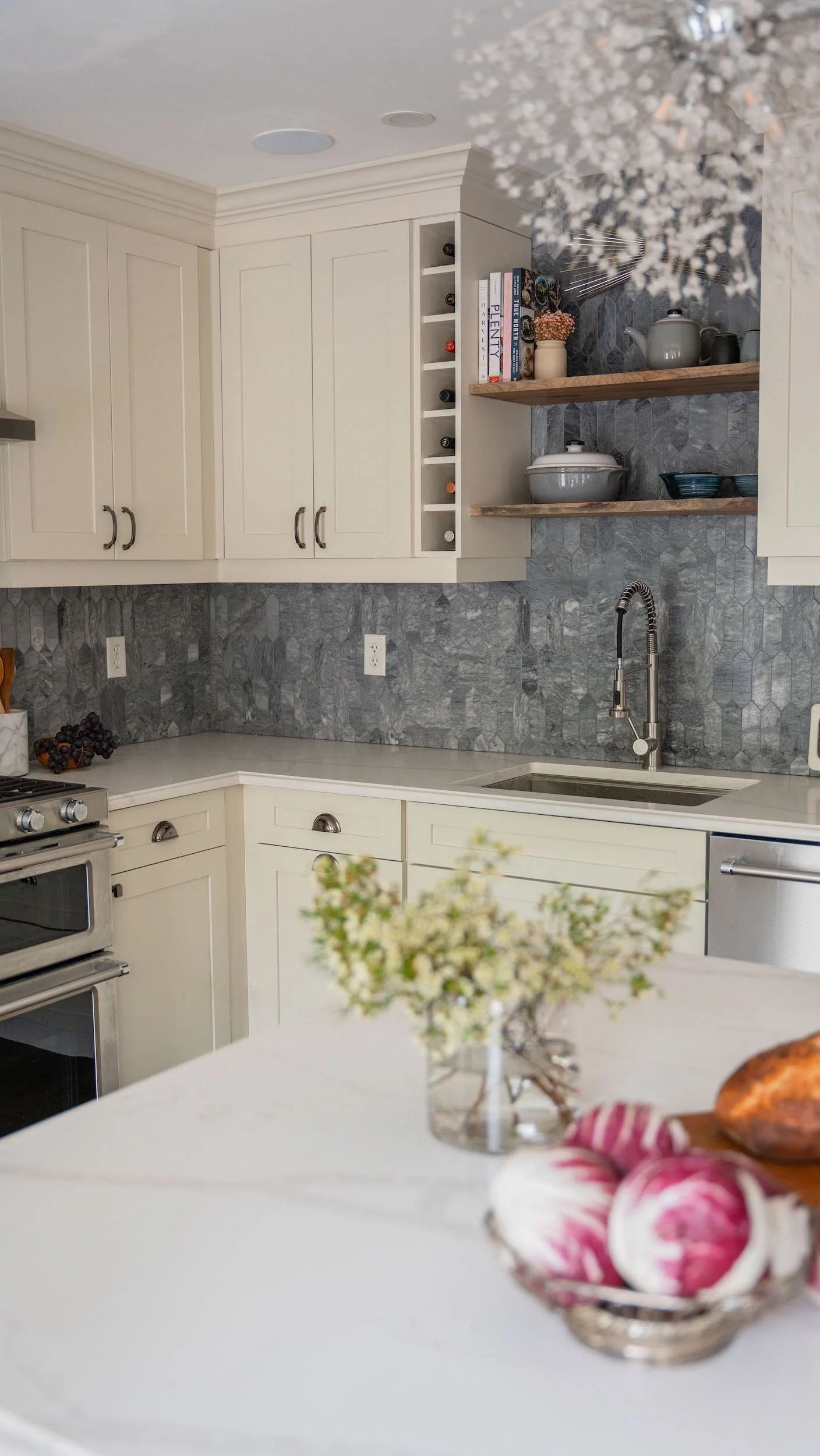 To make this happen in our kitchen, we chose classic shaker-style cabinets to anchor the design, complete with hand-painted knobs that match the warm, off-white cabinetry — a subtle nod to traditional styling.