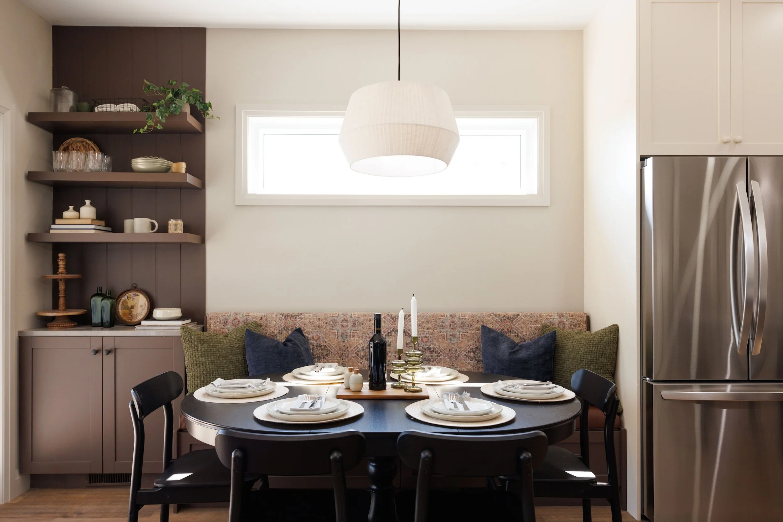 To enhance that nostalgic feeling, we added a vintage plate rack that feels like it’s always been part of the space. Colours from my granny’s rug are infused all over the kitchen and dining area, in the runner, the banquette fabric, the plate rack, and in the décor throughout.